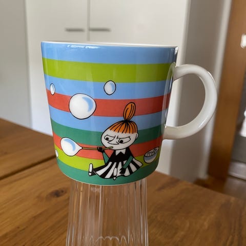 Myynnissä tuotannosta poistunut Arabian muumimuki Saippuakuplia. Muki on uusi. Tarra on paikoillaan.