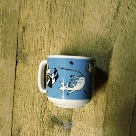 Myynnissä siis todella hyvin säilynyt, Suomessa 1990-luvulla valmistettu Muumipoika-muki.