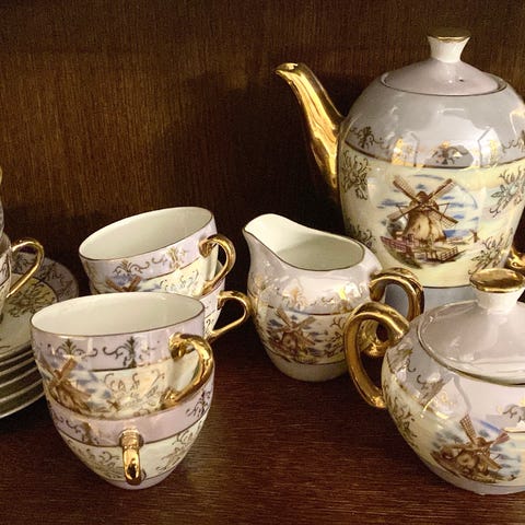 Harvinainen hieno kahviastiasto reikäposliinia mummin peruja, tarina kertoo astiaston olevan peräisin Ruotsista. Astiat hyvin kevyitä. Yksittäisiä kuvia kommenteissa. Sisältää yhteensä 11 kpl kahvikuppeja ja 11 tassia, 1 ylimääräinen tassi erilaisella kuviolla. Ei leimoja eikä tekstiä pohjassa. Kahvikupin vetoisuus 1 dl, korkeus 5 cm, leveys 6 cm. Lautasen halkaisija 12 cm.