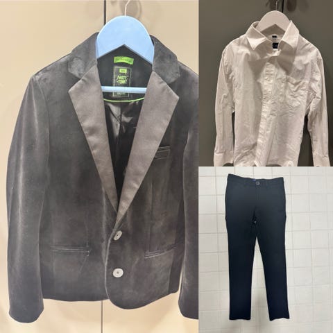 Kerran käytetty häissä. Nätti slimmi malli. Paidassa kaunis kudottu kuosi. Merkki Next. Koko 134 cm/ Housujen sivupituus 77 cm. Paidassa kaunis kuosi.