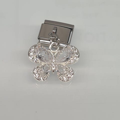Nomination Classic rannekoruun sopiva roikkuva vaaleanpunainen perhonen korupala. Materiaali kullattu messinki ja lasi sekä ruostumaton teräs. Ei aito Nomination.