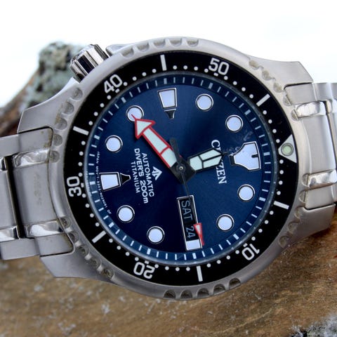 Citizen Promaster Eco-Drive AP0440-14F Diver's 200 m (tool watch suitable for scuba diving)Under the dial, 4 solar cell segments are just visible. The 7878 caliber Eco-Drive movement used in this watch can run for 180 days on its secondary power cell before it needs light exposure for recharging. The movement has a ± 20 seconds per 30 days accuracy specification (within a normal temperature range of 5°C/41°F to 35°C/95°F).