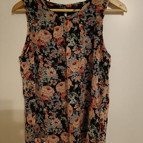 Kukkakuviollinen, pohjaväriltään tummansininen hihaton paita/toppi. Viskoosia (100%).