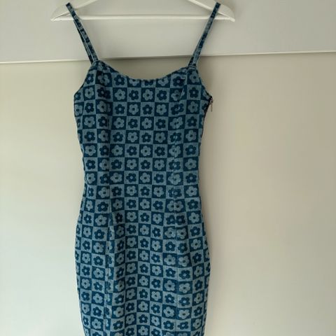 Kangasmekko, Juhlamekko, koko 34.Väri: vaaleansininen/kukkakuvio. Pitkä vetoketju takana. Hihaton, vuoriton.