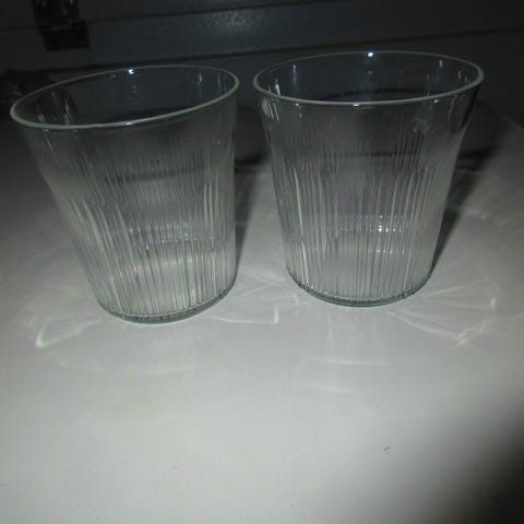 - Kirkas mehulasi/ juomalasi, 2 kpl. Malli 2204, korkeus 14,2 cm, suuaukon halkaisija 6 cm. Suunnittelija Tapio Wirkkala.
