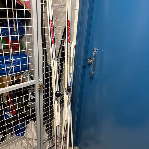 Kahdet retrosauvat 1990 luvulta , molemmat 125cm. Sinisissä toisen sompa rikki