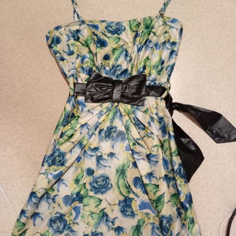 Käyttämätön. Tansseihin tai juhliin STI- n ruusukuvioinen leninki. Punaiset kukat, oranssiin vivahtava. Vuorellinen. Helmaosassa 2 alushametta, jotka vähän kohottavat laskostettua helmaa. Yläosa 2-kertainen,vaikutelma erillisestä yläosasta. Uusi. Koko 40, pituus 102, vyötäröstä helmaan 62cm. Hp 12
