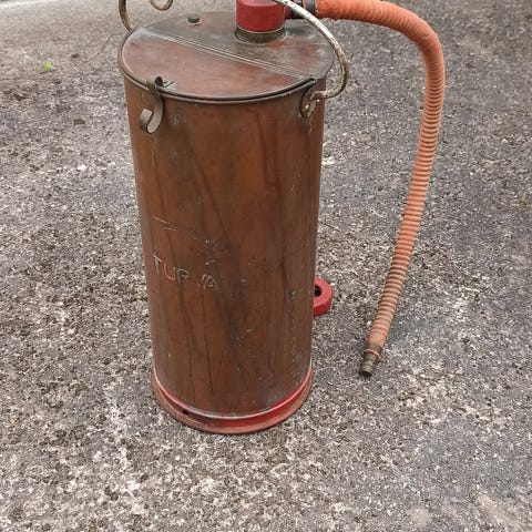 Wanha Turva-merkkinen paloruisku. Toimii. Joko messinkiä tai kuparia, en tiedä.