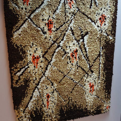 Loistava kuntoinen turkoosi-sininen Terttu Tomeran suunnittelema Katiska ryijy.