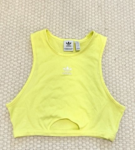 Kerran käytetty ja pesty, mutta valitettavasti itselle hieman turhan napakaksi todettu. Tämä on tiukempi kuin Adidaksen S-koon topit yleensä, sanoisin että vastaa paremmin kokoa XS. Materiaalilappu irrotettu (kierrätetty polyesteri, elastaani), muuten vastaa uutta.
