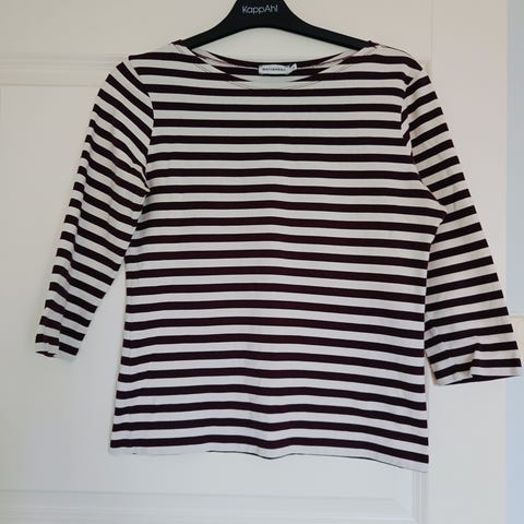 Myydään muutaman kerran käytetty Marimekon Ilma Tasaraita -paita. Kokomerkintä XS, mutta menee myös S-kokoiselle. Pientä pesuhaitua pinnassa, mutta muuten moitteeton kunto.