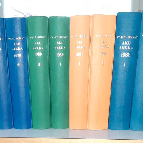 Aku Ankan vuosikertoja keltaisissa kansioissa 25 kpl. Vsk. 1976 ja 77, 4 kansiota. Vsk. 90-2000, vsk. 91 toinen kansio puuttuu (yht. 21 kansiota). Erittäin siistejä, hyvä setti mökkilukemiseksi.