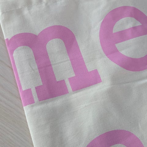 Käyttämätön Marimekon kangaskassi. Pinkki teksti. Ollut kaapissa, siksi rypyssä.