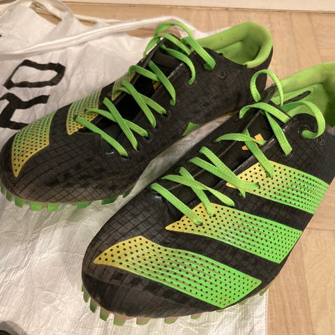 Käyttämättömät Adidas Adizero Finesse pikajuoksupiikkarit. Kengän koko on EU 47,3, mutta ovat todellisuudessa huomattavasti ilmoitettua kokoa pienemmät. Oma jalkani on juoksukengissä normaalisti 46,5 ja nämä ovat minulle pienet. Kenkiä kävi sovittamassa kaveri kenellä oli 46 kokoinen jalka ja oli hänellekin hieman pienet, eli sopii varmaan n. 45-kokoiseen jalkaan. Mukaan käyttämättömät piikit ja avain.