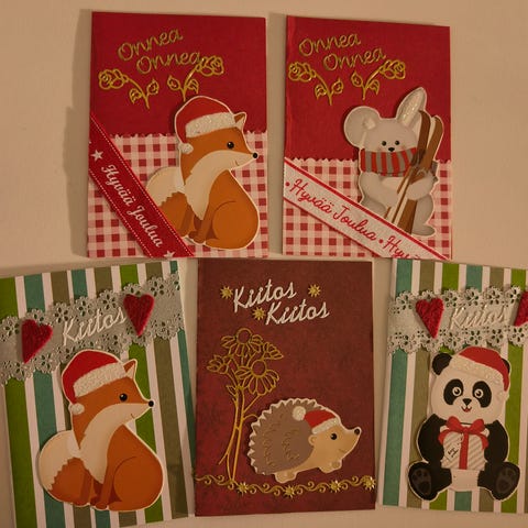 2-osaisia, suurehkoja joulukortteja englanninkielisin toivotuksin. Osassa korteista toivotus on irtolehdellä, jonka voi halutessaan poistaa. 1,50e/ kpl, kirjekuori sisätyy hintaan.