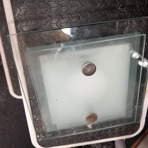 Valaisinten materiaali harjattu teräs / huurrelasi. Yhdessä lasissa pieni valkoinen piste, ei vaikuta käyttöön.