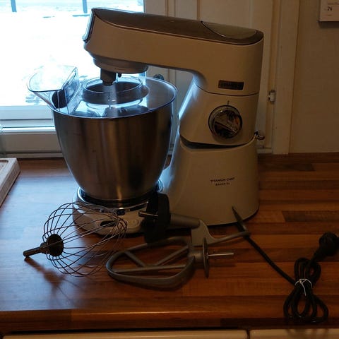Kenwood multione yleiskone, jäänyt todella vähäiselle käytölle. Mukaan kaikki paketissa olevat lisävarusteet kuten vihannes-/teholeikkuri ja blenderi. Teho 1000W, kulho 4.3l.