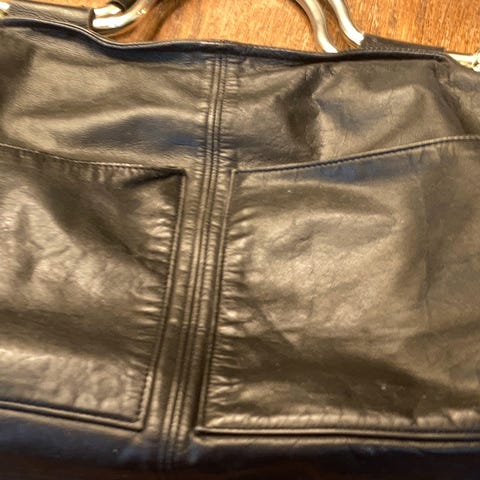 Mustaa nahkaa, jäykkä, sisäpuoli vuorattu vakosametilla.