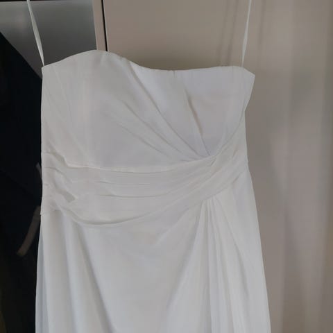 Suomalaisen Muotikuun leninki. Sopii vaikka hääpuvuksi. Koko reilu ja kudos joustava. Väri bees, lohenpunainen, harmaa, luonnonvaalea. Päälysmekko verkkomainen ja joustava, alus mekko luonnonvalkoinen ja joustava.