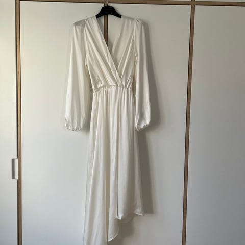 Mekko on lyhennetty 160cm + matalat kengät pituuteen, mutta taitoksen voi avata, jolloin mekko sopii n 170cm pitkälle.