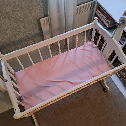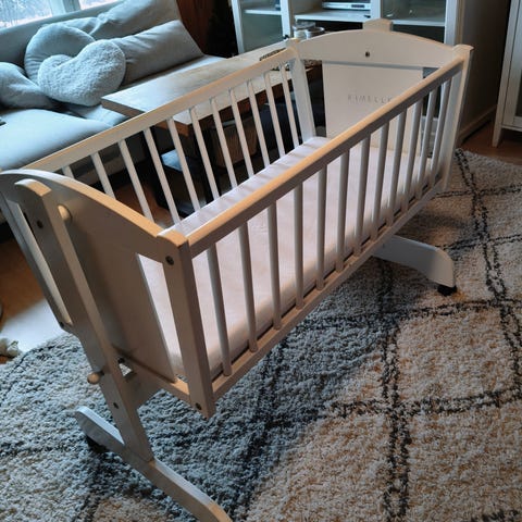 Vähän käytetty vauvan kehto, pyörät alla, keinunnan lukitus, verhokiinnike. annetaan mukaan; kahdet verhoilut, patja, sivupehmusteet, vuodevaatteet