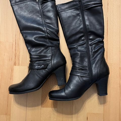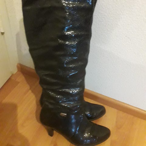 Mustat aitonahkaiset (liskoimitaatio) saapikkaat. Koko 37 ja vastaa hyvin kokoaan. Vetoketjut sisäsivuilla. Pakettiautomaatti 8.90e