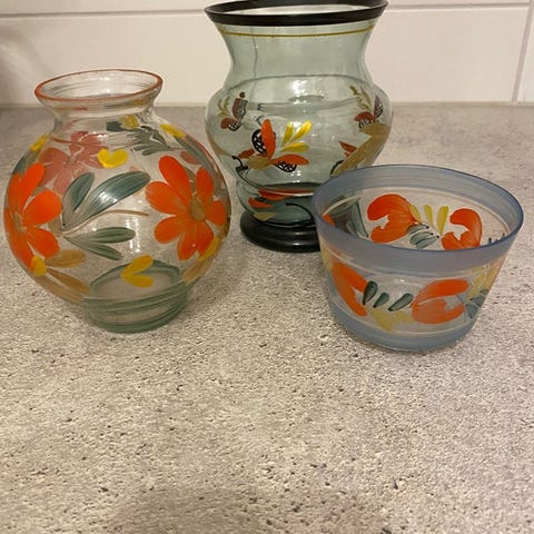 Käsinmaalattu värilasimaljakko, muistaakseni Riihimäen. Ehjä, ei vesijälkiä ja muutenkin siisti. Korkeus n 13,5cm ja suun halkaisija n 10cm. postitus tavallisena postipakettina 9 eur tai nouto.