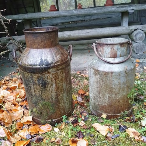 Kuvissa oleva vanha ja harvinaisempi maitotonkka vuodelta 1941. Mielestäni suhteellisen hyvin säilynyt ikäisekseen. Pohjassa ruostetta, ja pari pientä reikää, joten vettä ei pidä ilman pohjan paikkausta. Hieno esine pihan somistukseen!