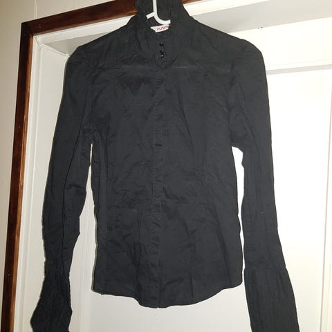 Valkoinen paita, olkasaumojen etupuolella mustia ja hopeanvärisiä paljetteja.