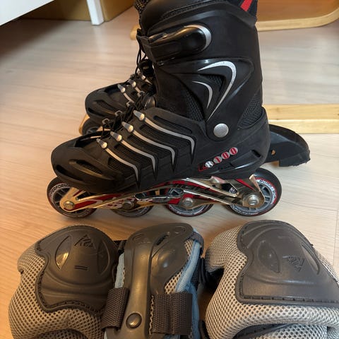 Myydään naisten erittäin hyvässä kunnossa oleva rullaluistinsetti. Pitää sisällään rullaluistimet, polvisuojat, kyynärsuojat ja rannesuojat.