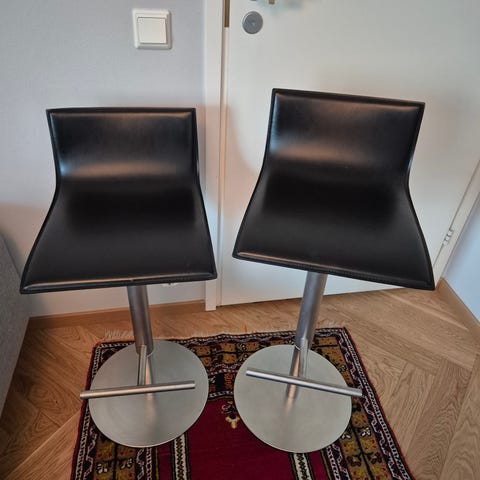 Näitä on 3, kaikki siistissä kunnossa. Mukaan yksialkuperäinen istuinpehmuste, ja näitä kuvassa näkyviä (löytyy vihreää + harmaata 3+3 kpl). Mukavat ja tukevat istua ja kiivetä, sopinut meillä lapsenki käyttöön kun ei kaadu millään. Vahva runko. Istuinkorkeus 71 cm. Baarituolit, vahvaa terästä (?). Kromia. Yhdestä tuolista pieni musta muovinen jalkatassu osin pois. Yhteishinta 600€.