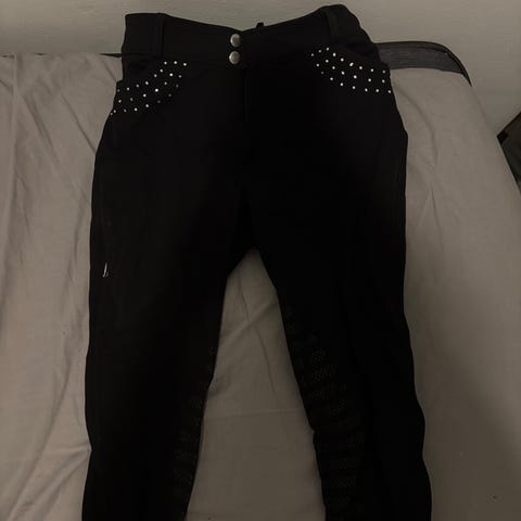 Keinomokkapaikkaiset mustat CRW:n ratsastushousut kokoa 42. Kangas on reilusti joustavaa ribbimäistä kangasta. Tarrapuntit ja edessä kaksi vetoketjullista taskua.