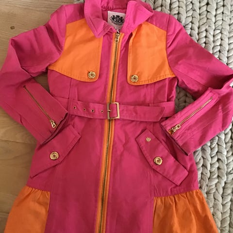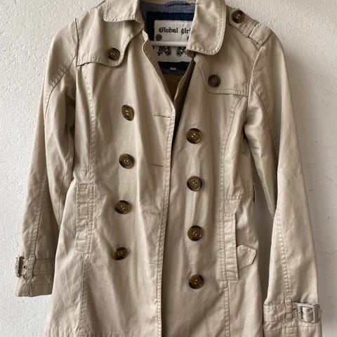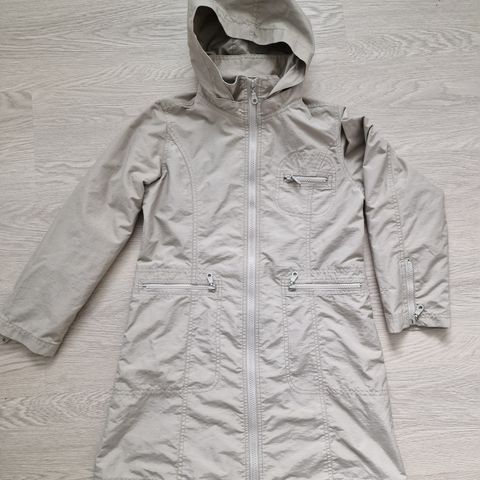 DKNY kitinvärinen kerran juhlissa ollut trenssitakki. Ostettu lastenvaatteiden merkkiliikkeestä Ranskasta. Materiaali vähän kosteudenpitävää polyamidi ja puuvillan sekoitusta. Alaspäin levenevä malli, vyötäröllä vyönauha, selässä koristenapit ja kaunis leikkaus. Upea!