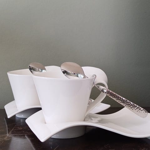 - 1 setti (kuppi ja aluslautanen). Kupin korkeus 9,5 cm, leveys 11 cm. Lautasen koko 15,5 cm x 22 cm.