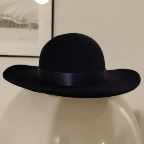 Lierihattu, 100 % paper, vaalea beige ja sinistä. Pään ympärysmitta 58 cm. Ei käytetty, uusi