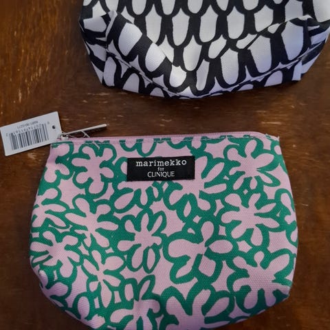 Marimekko - Pussukka. Päällä vetoketju. Sisällä kummallakin sivulla täyspitkä avotasku. Pohjassa näköjään pieni repeämä.... noh. Korkeus n.12cm. Pohja n.6x23cm.