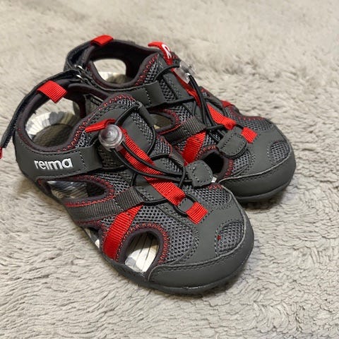 Harmaat sandaalit oranssein tehostein. Koko 32.