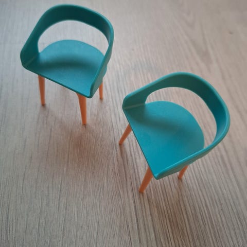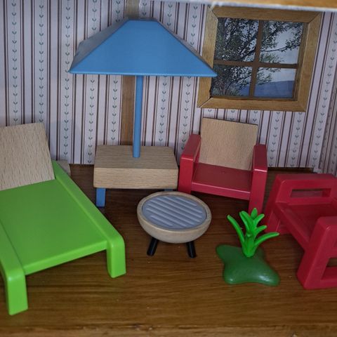 Huonekaluja nukeille. Settiin kuuluu yksi pienempi huonekalu ja yksi isompi. Isompi huonekalu on punainen ja metallinen penkki. Penkki on 19 cm leveä ja 24 cm korkea. Penkki sopii hyvin nukeille istumista varten. Pienempi huonekalu on riippumatto joka on puoleksi puinen ja puoleksi kankaasta tehty. Riippumatto on 15 cm leveä ja 10 cm korkea. Huonekalut ovat erinomaisessa kunnossa.
