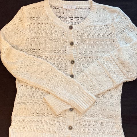 Elea merkkinen luonnonvalkoinen neuletakki, ei nappeja, edessä pitsineuletta, takaa sileää, lähes käyttämätön