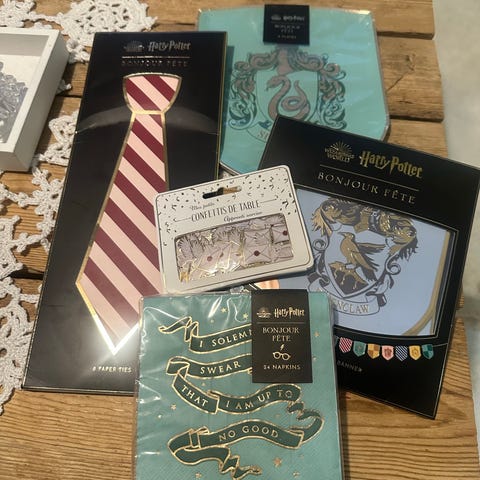 Myydään Harry Potter -teeman syntymäpäiväjuhlien rekvisiittaa, pöytäliina ja banner.