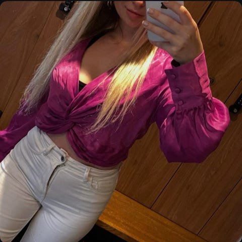 Pinkki-puna-limen värinen sifonkinen pitkähihainen paitapusero.