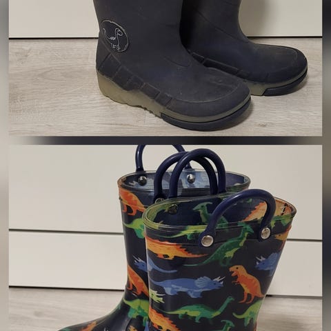 Peuhu kumisaappaat koko 24/25, dinosauruskuvio ja vilkkuvat pohjalliset. Ohuet, ei vuorta, sopii hyvin sateisiin kesäpäiviin tai villasukan kanssa ympäri vuoden. Sisäpituus 16,5cm.
