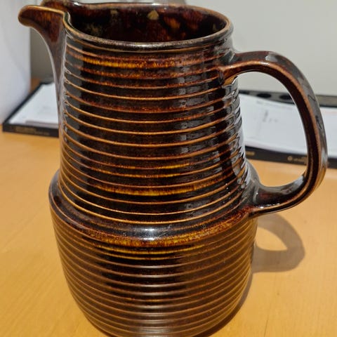 Siisti ja ehjä Arabia Mahonki kahvikannu / teekannu, design Ulla Procopé. Ollut valmistuksessa 50-60-luvuilla. Korkeus n.18cm, halkaisija 13cm.