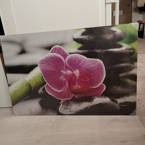 Kaunis kokonaisuus, kukka-aiheinen taulu ja kehykset.
