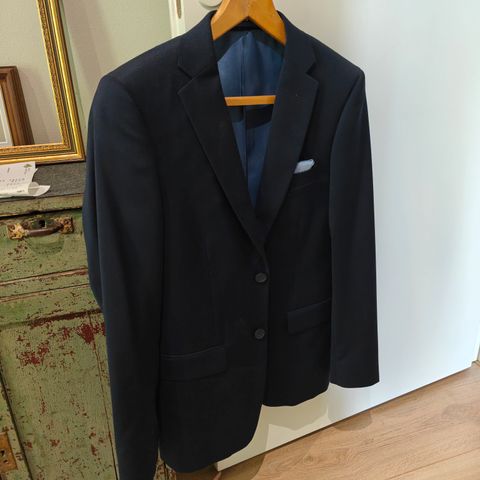 Tummansininen Dressmann puku: takki 46 short slim fit, housut 31-30 slim fit. Tummansininen vyö ja kuvassa näkyvä kauluspaita mukaan. 2 käyttökertaa.