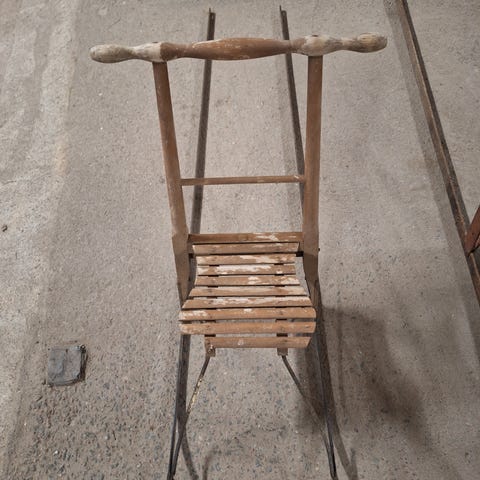 Kuvan potkukelkka, ehjä mutta ollut koristeena vuosia pihalla. Nouto salosta.