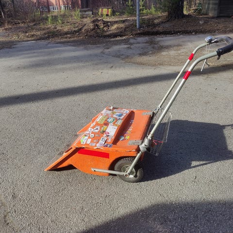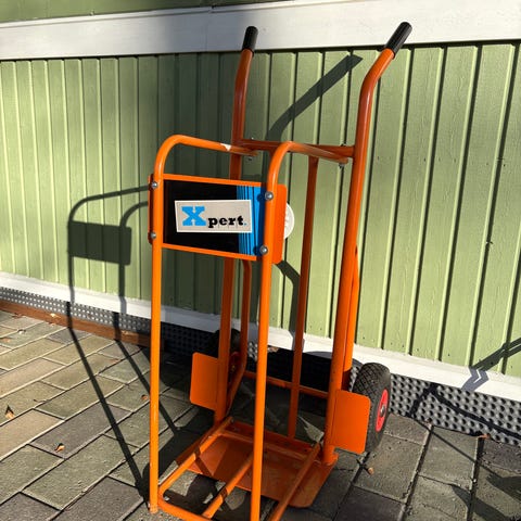Tukeva kaksipyöräinen kottikärry halkojen tms. siirtoon. Kori vaneria, koko 65 x 95 cm, laidan korkeus 40 cm.