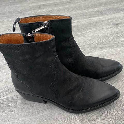 Vähän käytetyt nahkanilkkurit hopean värisellä vetoketjulla. Korko 8 cm, sisämitta 24 cm ja pohja 3 cm. Kenkien ohv 159€. Postitus ok. Kulut lisätään.