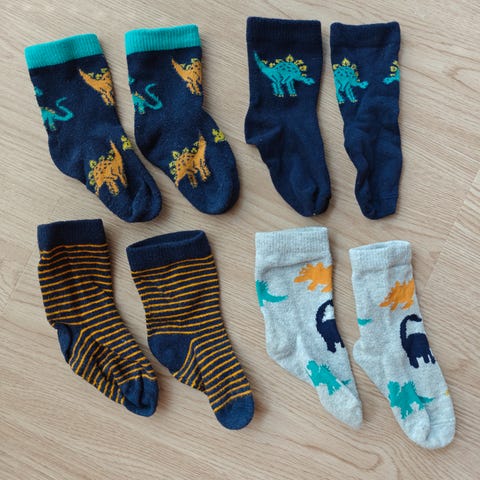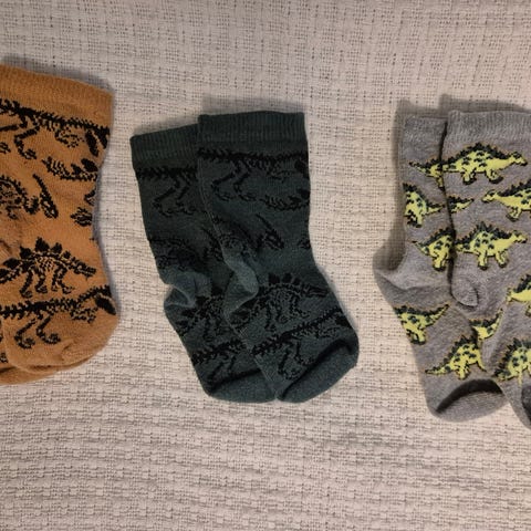 Neljä paria siistejä sukkia. Kääntövarrelliset paksumpia. Pupusukissa jarrut.