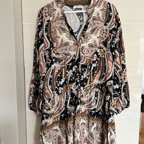 Kerran käytetty mekko. Koko 40 (iso koko,vastaa koko 42). Kai kai 50 cm ja pituus 102 cm. Materiaali 50 % viskoosia ja 50% puuvillaa. Ei joustava kangasta. Löytyy 2 röyhelöä. Postitus onnistuu